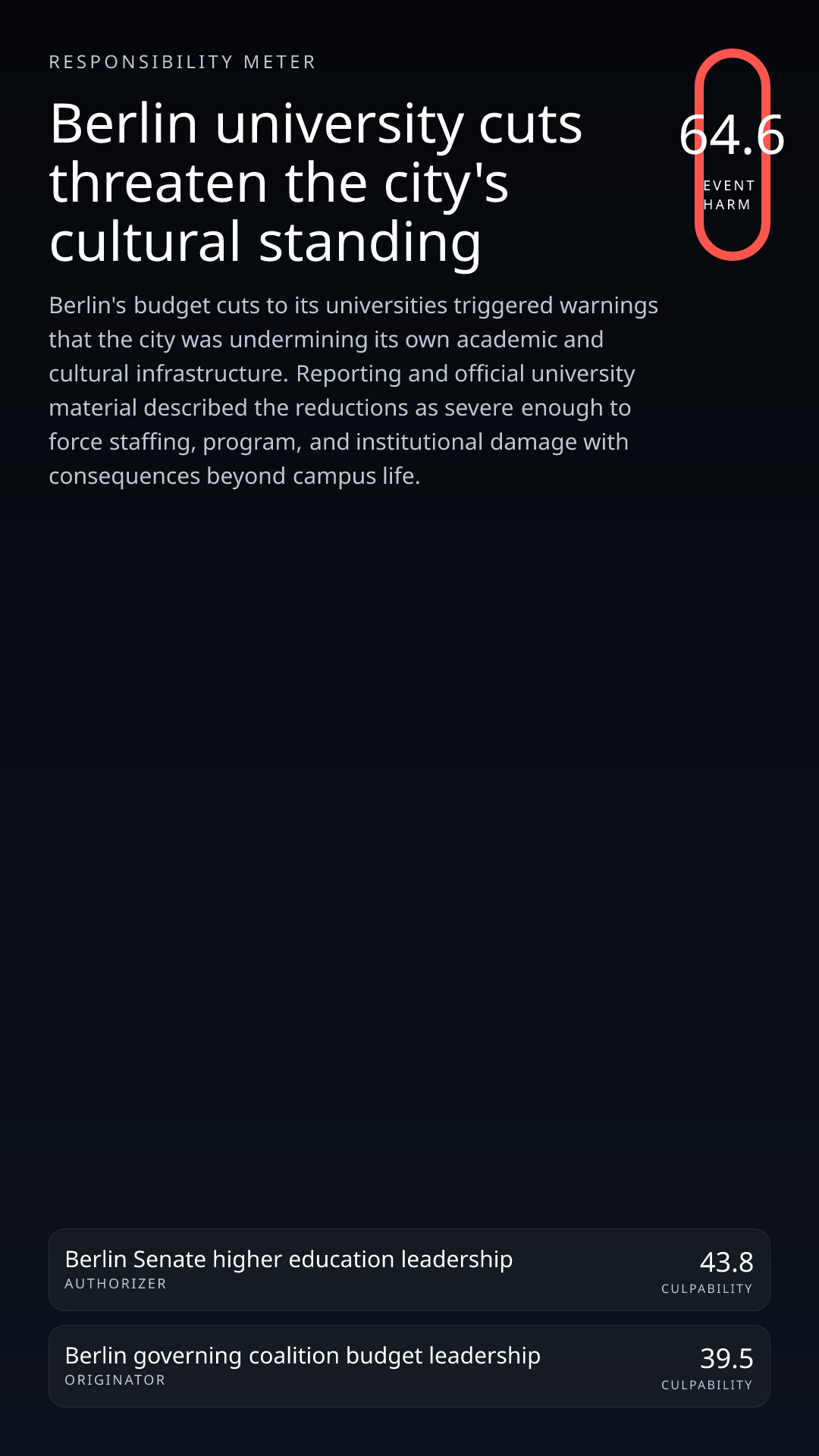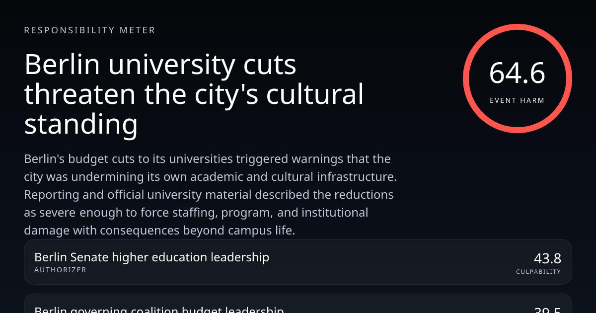 The Berlin Senate leadership responsible for higher education carries the main authorizing role because it backed the budget cuts despite clear warnings about academic and cultural damage.