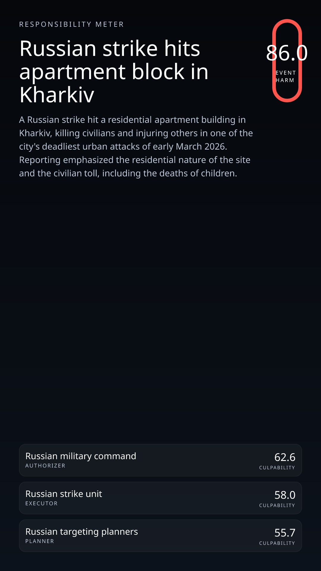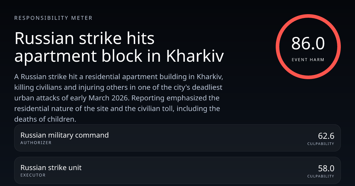 A strike on a major urban residential site in Kharkiv points beyond a field-level mistake to a broader command responsibility for approving or tolerating attacks with obvious civilian risk.